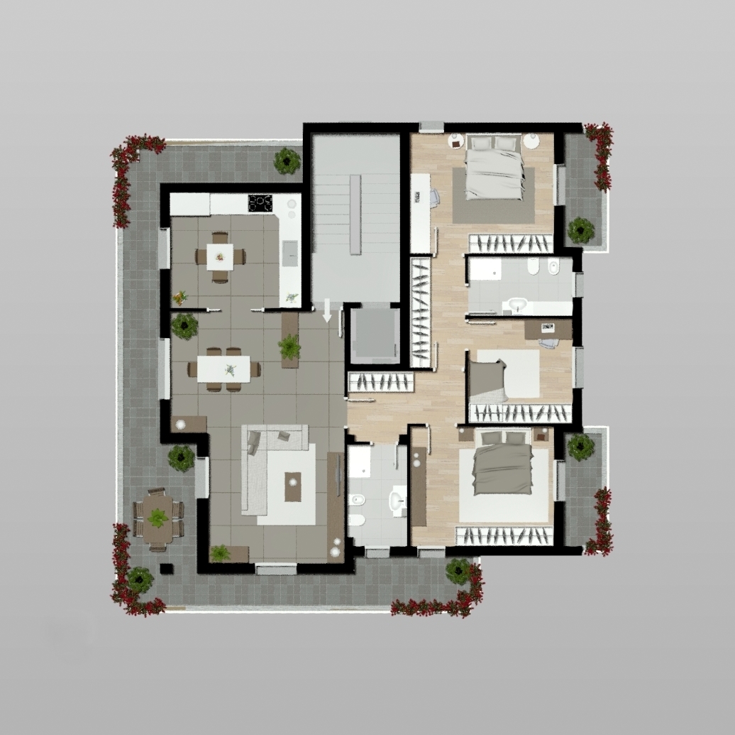 Alla soluzione di accede dal vano ingresso che si affaccia sull’ ampia zona giorno composta dal grande salone, una comoda zona pranzo e la cucina di dimensioni veramente generose. La zona giorno si affaccia sul terrazzo che contorna tutto l’ appartamento. La zona notte, ben delineata con i suoi ampi ed arredabili disimpegni, è composta da tre comode camere, e dai doppi servizi entrambi finestrati.