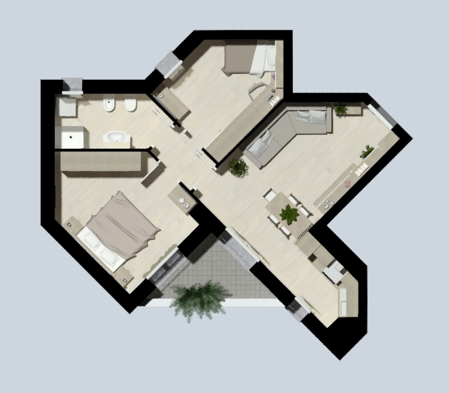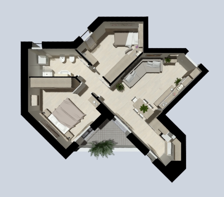 La soluzione è composta da una luminosa zona giorno open-space con cucina separata, una comoda camera matrimoniale, la cameretta e il bagno. La TERRAZZA completa la soluzione.