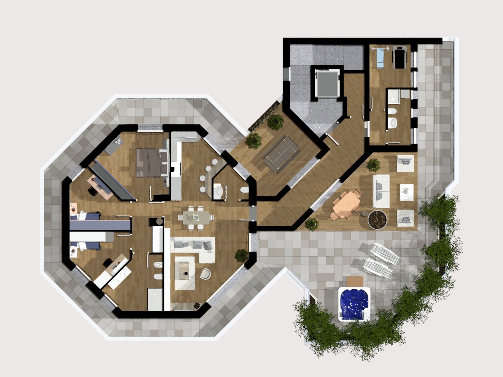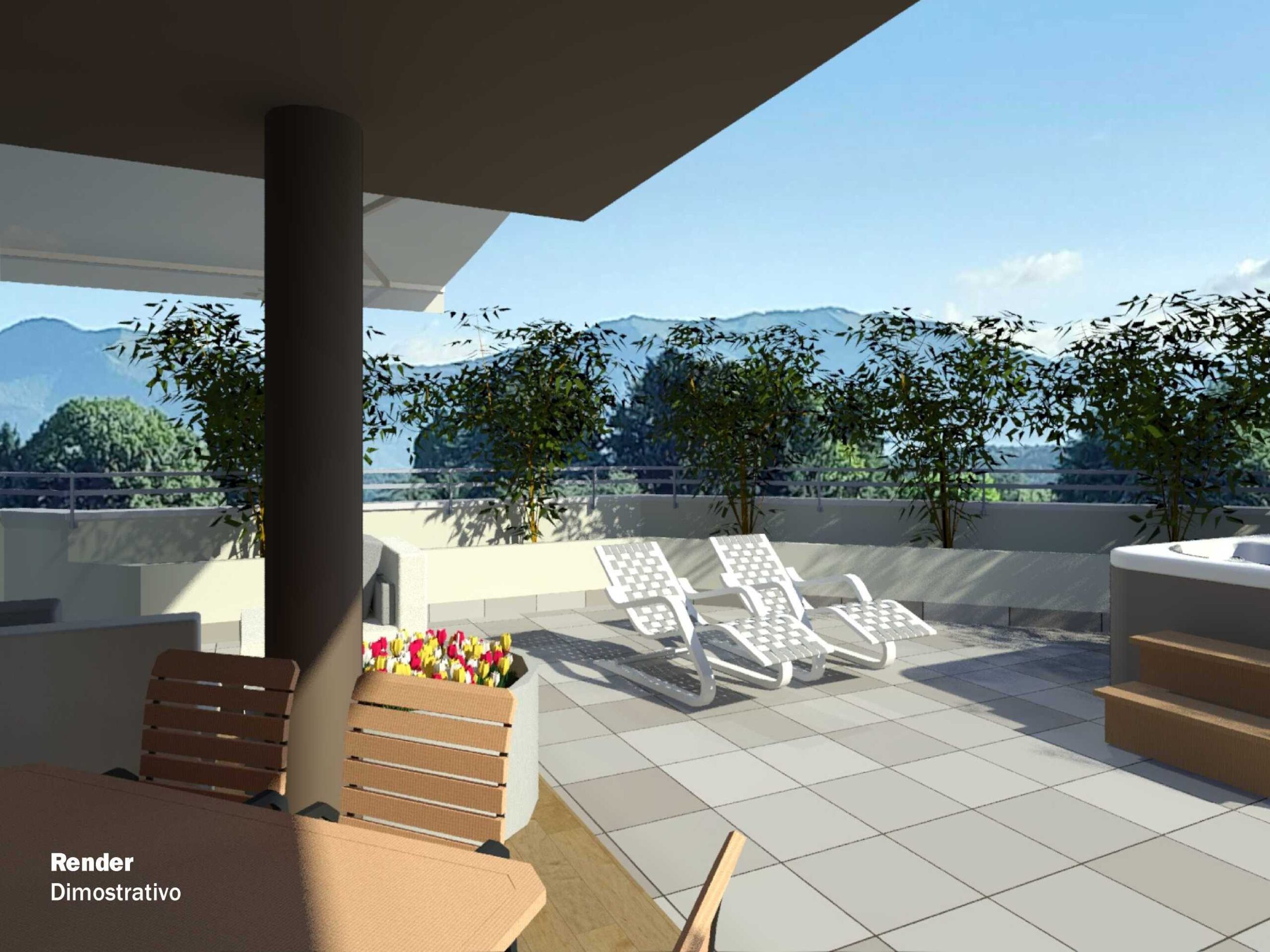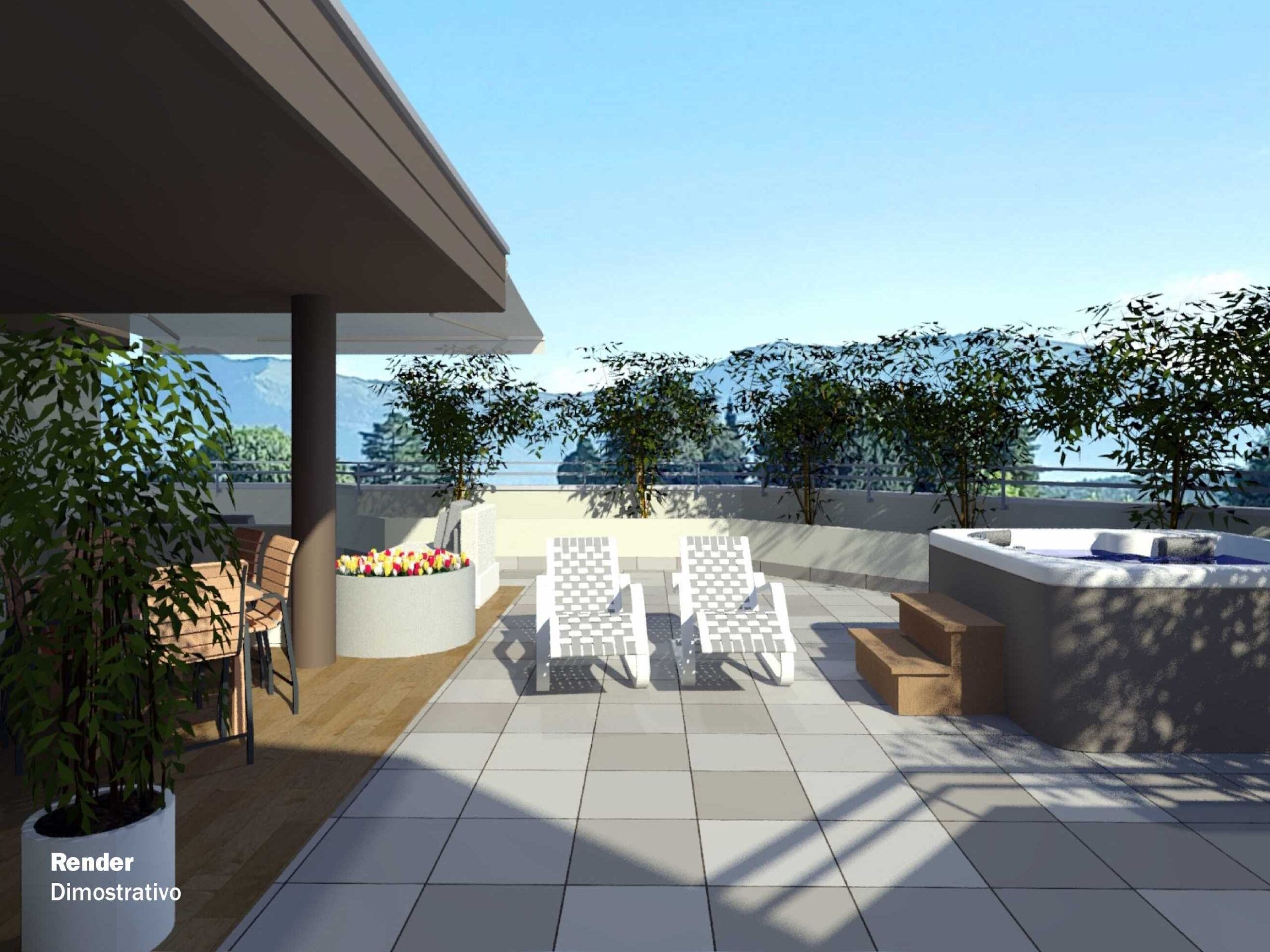 Sul terrazzo è possibile creare un bellissimo giardino pensile dove posizionare una piscina idromassaggio e godere di una splendida vista panoramica in totale relax.