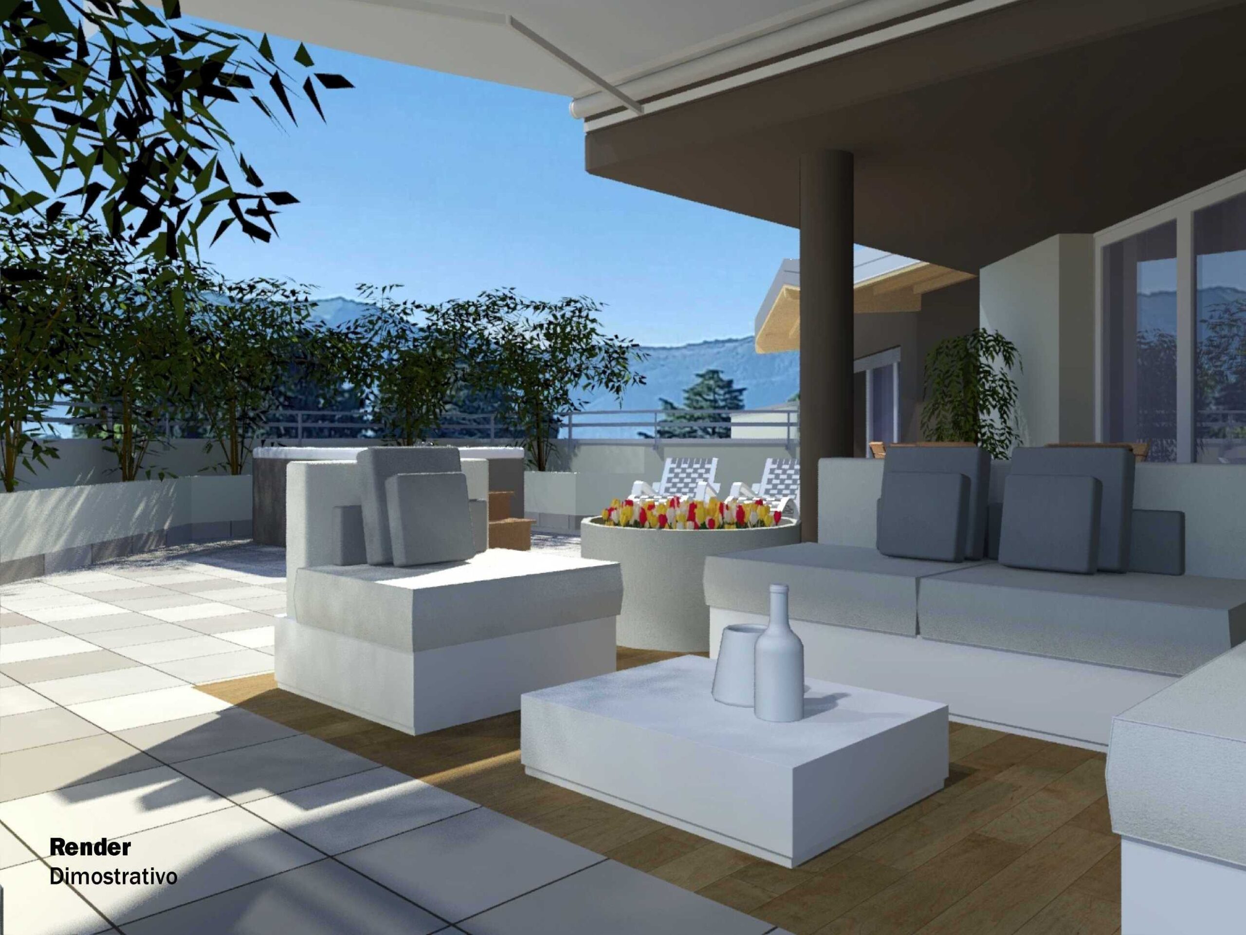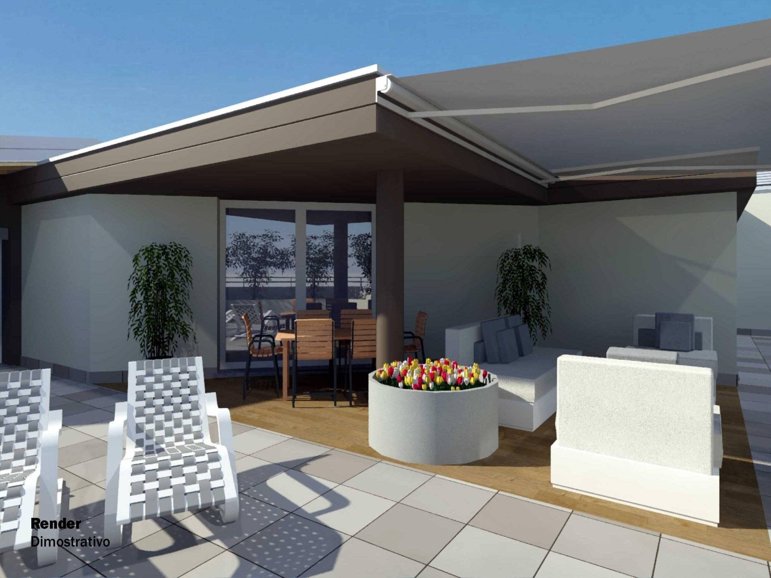 Sul terrazzo troviamo uno spazio coperto da adibire a giardino d’inverno, a veranda o semplicemente a living esterno per piacevoli momenti in compagnia e di relax.